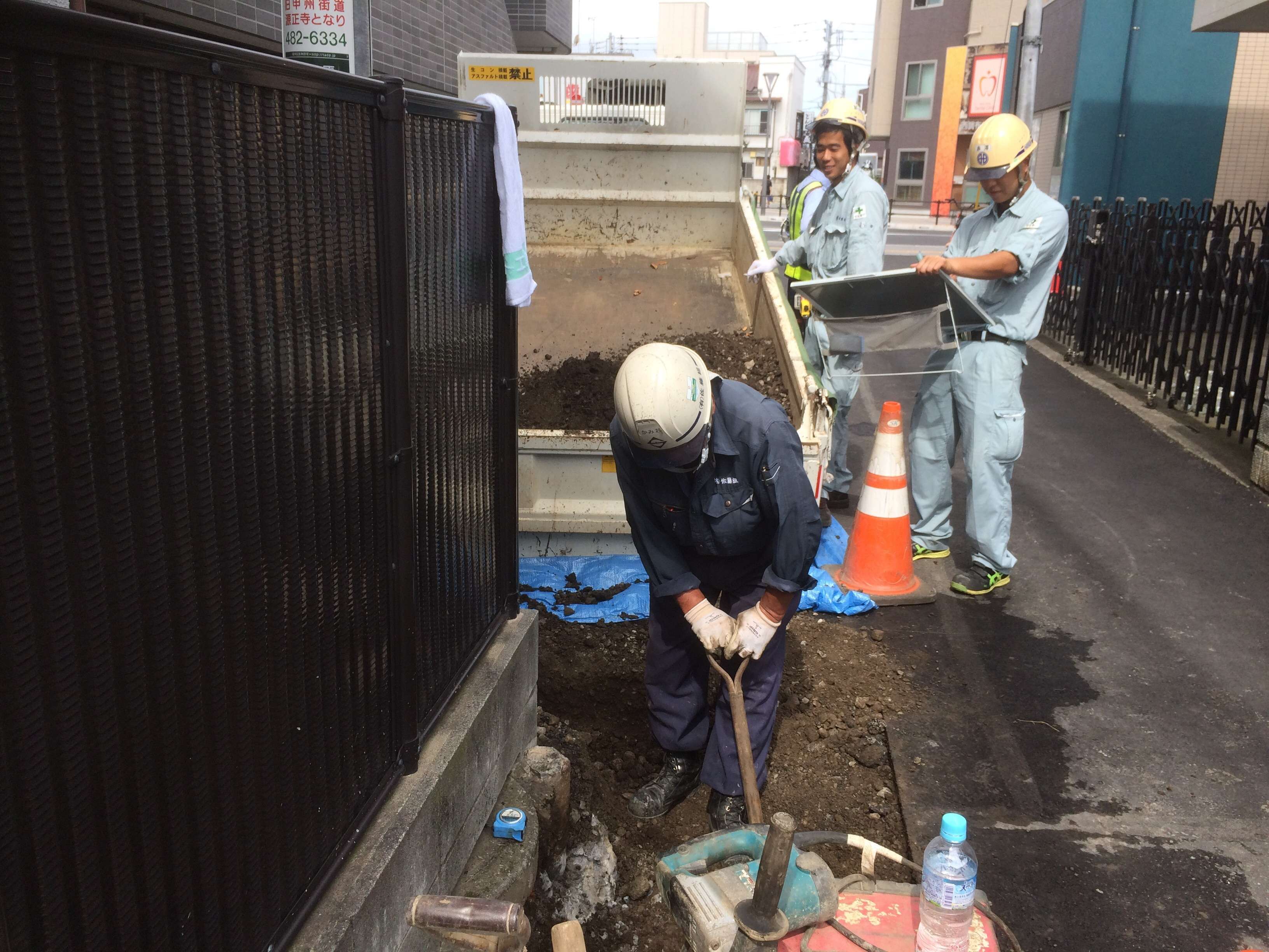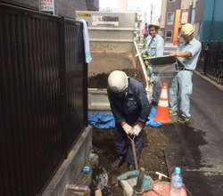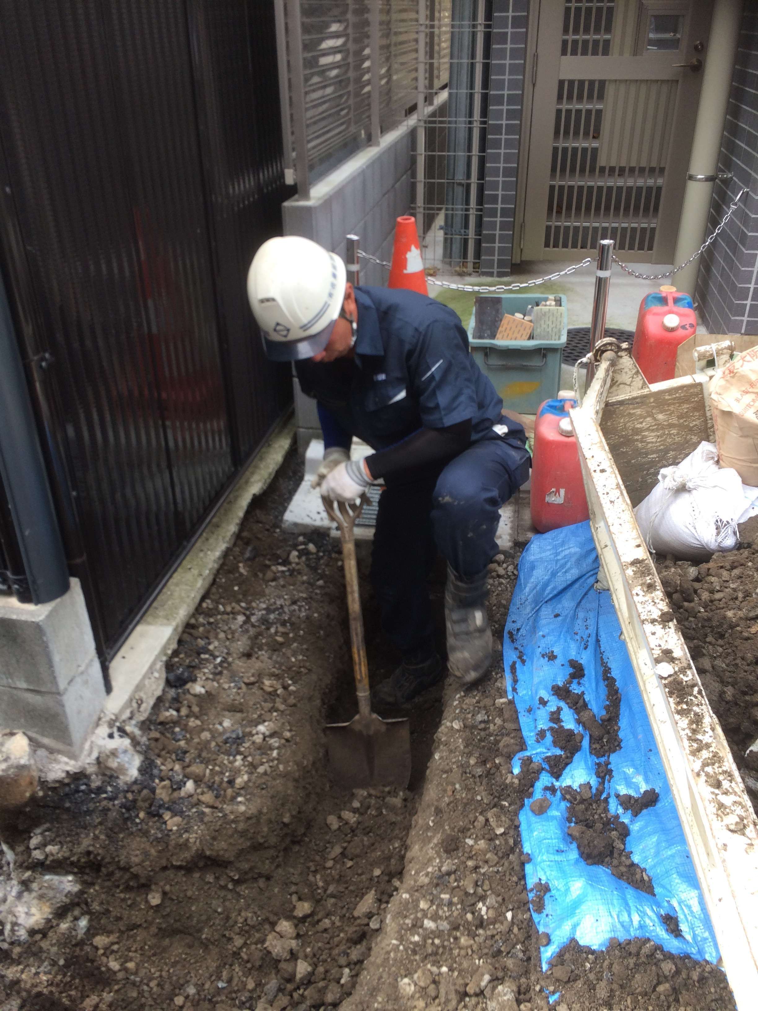 場所が狭く重機類が使えず、手掘り作業。笑